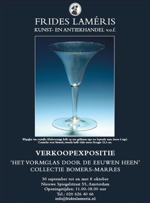 Back in 1986 the New York Times wrote: “the shop of a glass collector turned dealer, glass and porcelains present a colorful display. This glittering, two-story establishment in the heart of Amsterdam's antiques district is known for the sort of 17th- and 18th-century European glass vessels - engraved, cut and exquisitely blown bowls, vases and glasses - that Mr. Lameris acquired privately for 20 years before he gave up banking at the age of 42 in 1963 to become a dealer. The range of works spans 18 centuries, from Roman glass vessels of the first century onward.”